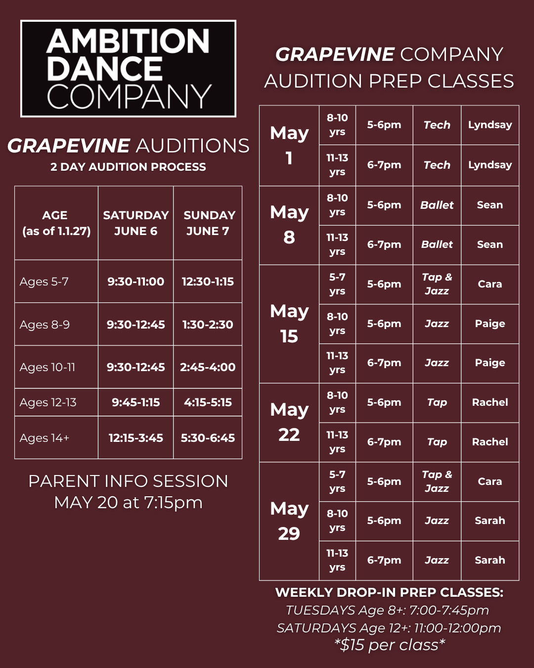 Summer Requirements: 15-25 based on age + required Summer Intensive