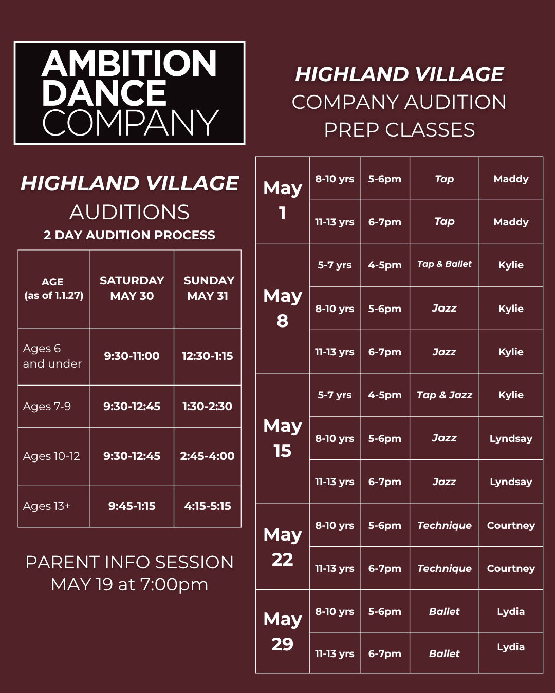 HIGHLAND VILLAGE AUDITION INFORMATION MAY 30-31